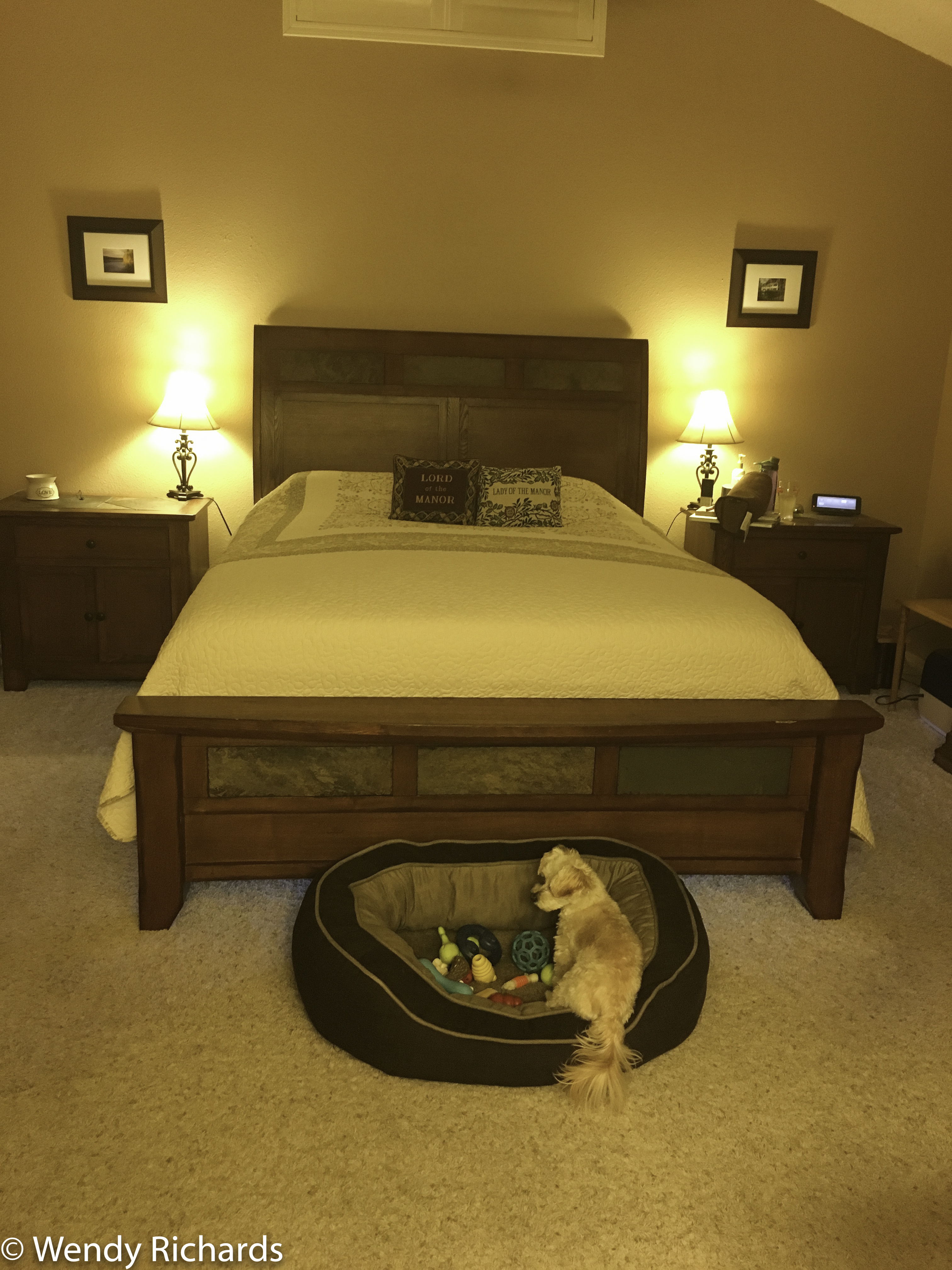 Here he is with all of his toys, in his dog bed and he looks upset that they are there.